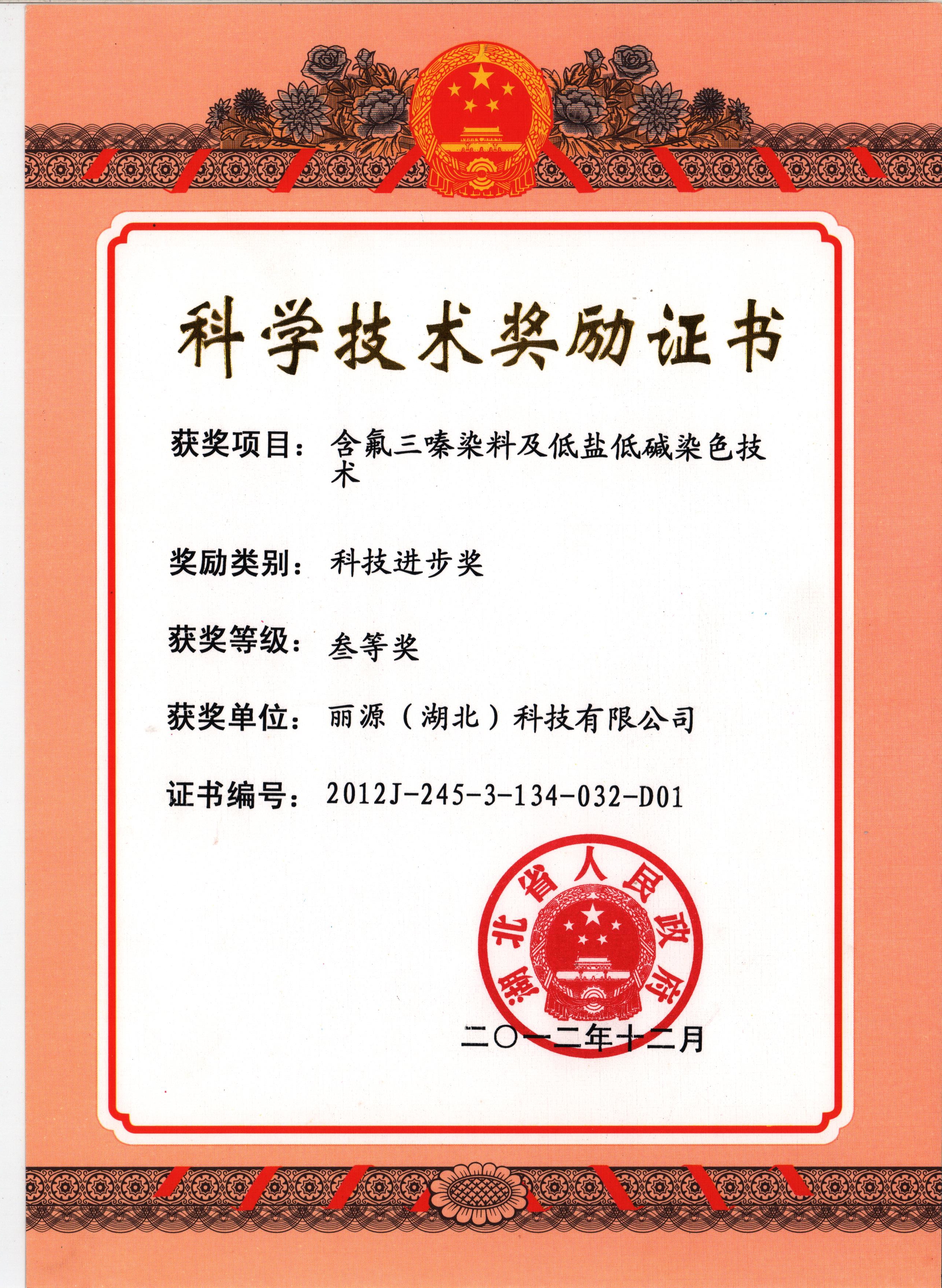 2012年12月,丽源科技含氟三嗪染料及低盐低碱染色技术获得由湖北省人民政府颁发的「科技进步奖三等奖」