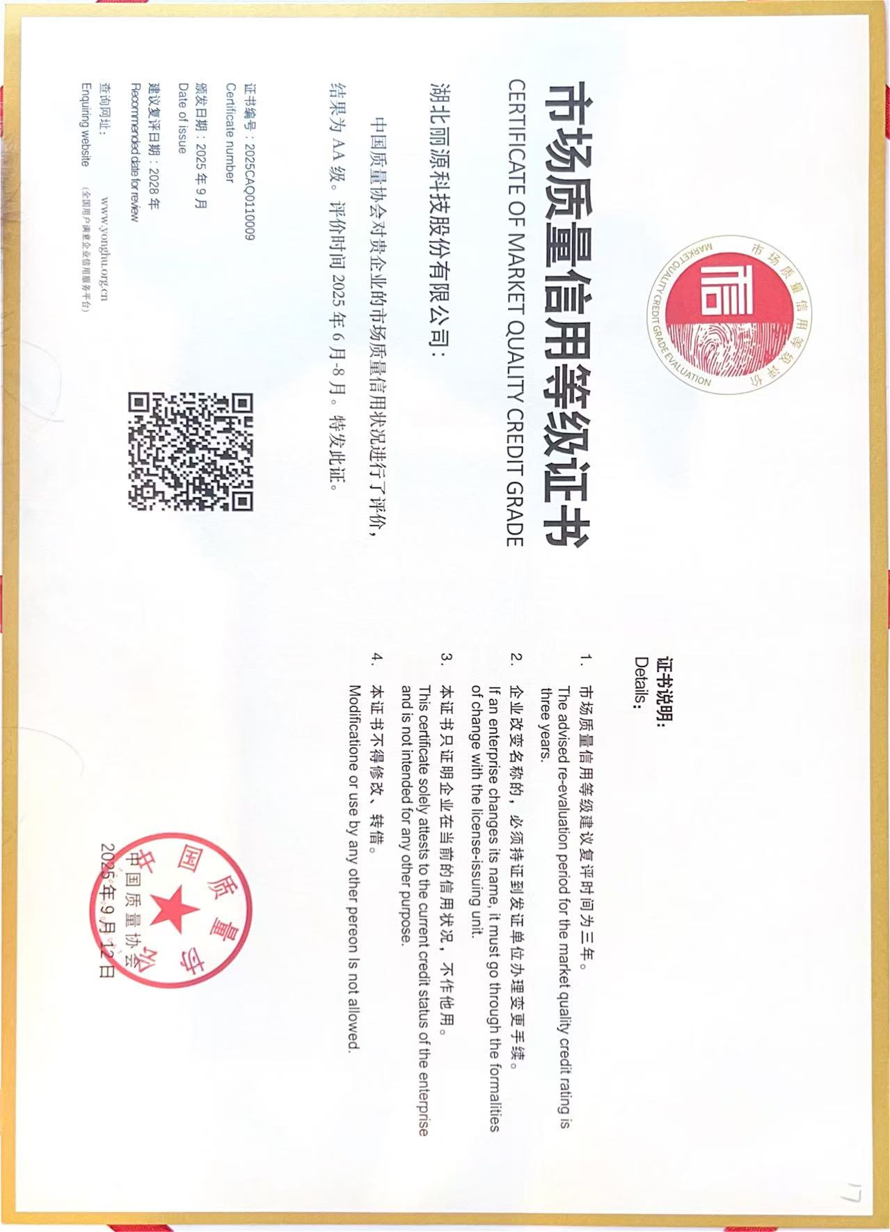 2025年12月,丽源科技被认定为「市场质量信用AA级企业」