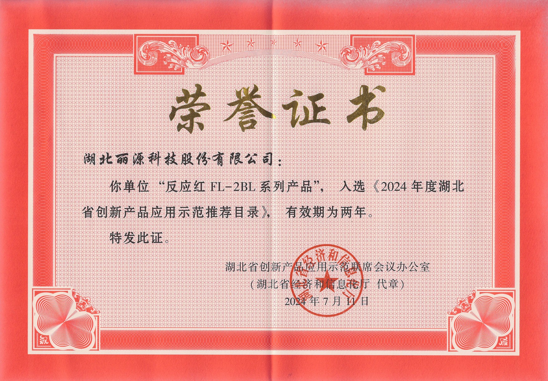 2024年7月,丽源科技反应红FL-2BL系列产品入选「2024年度湖北省创新产品应用示范推荐目录」
