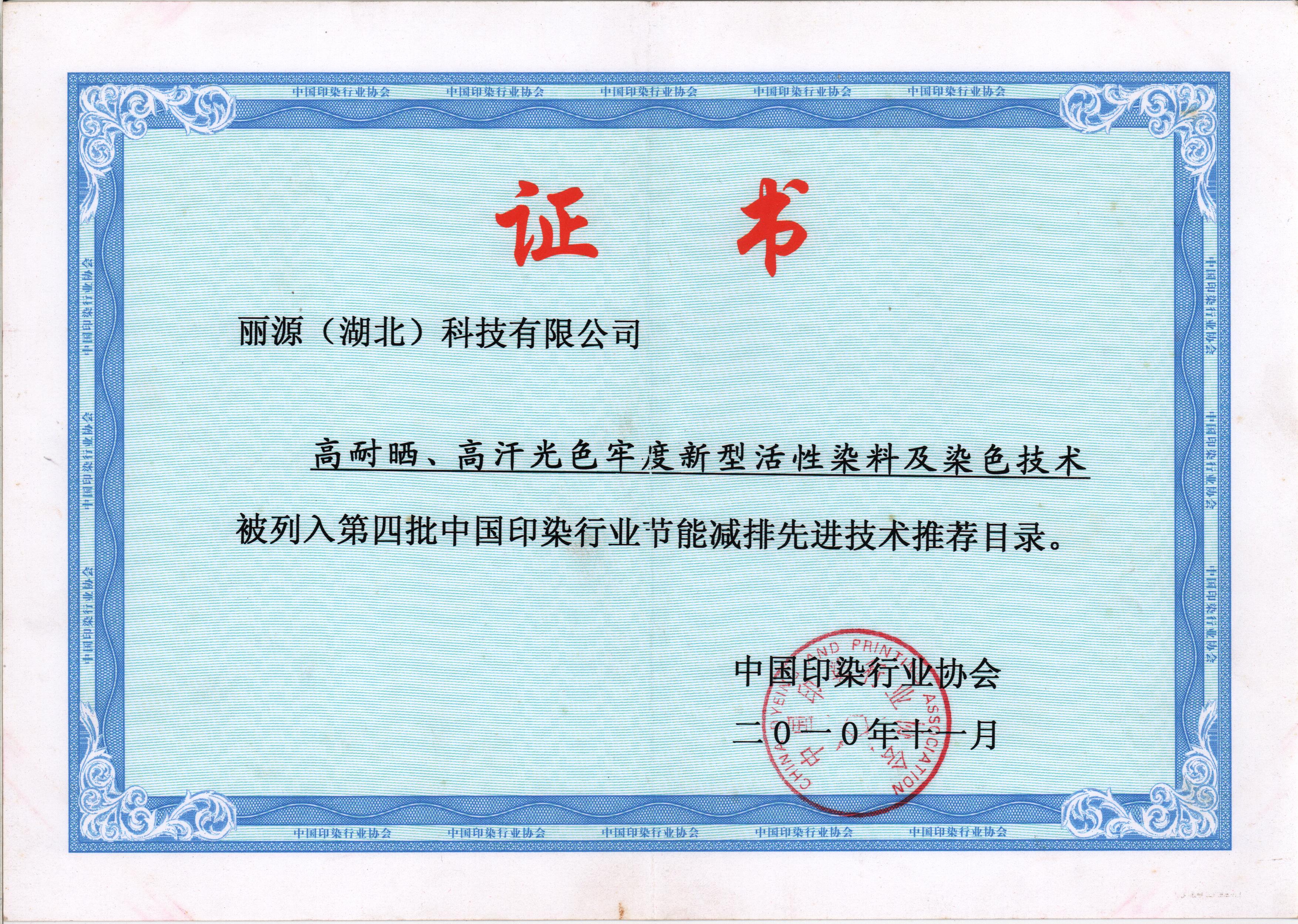 2010年11月,丽源科技高耐晒高汗光色牢度新型活性染料及染色技术被中国印染行业协会列入第四批「中国印染行业节能减排先进技术推荐目录」