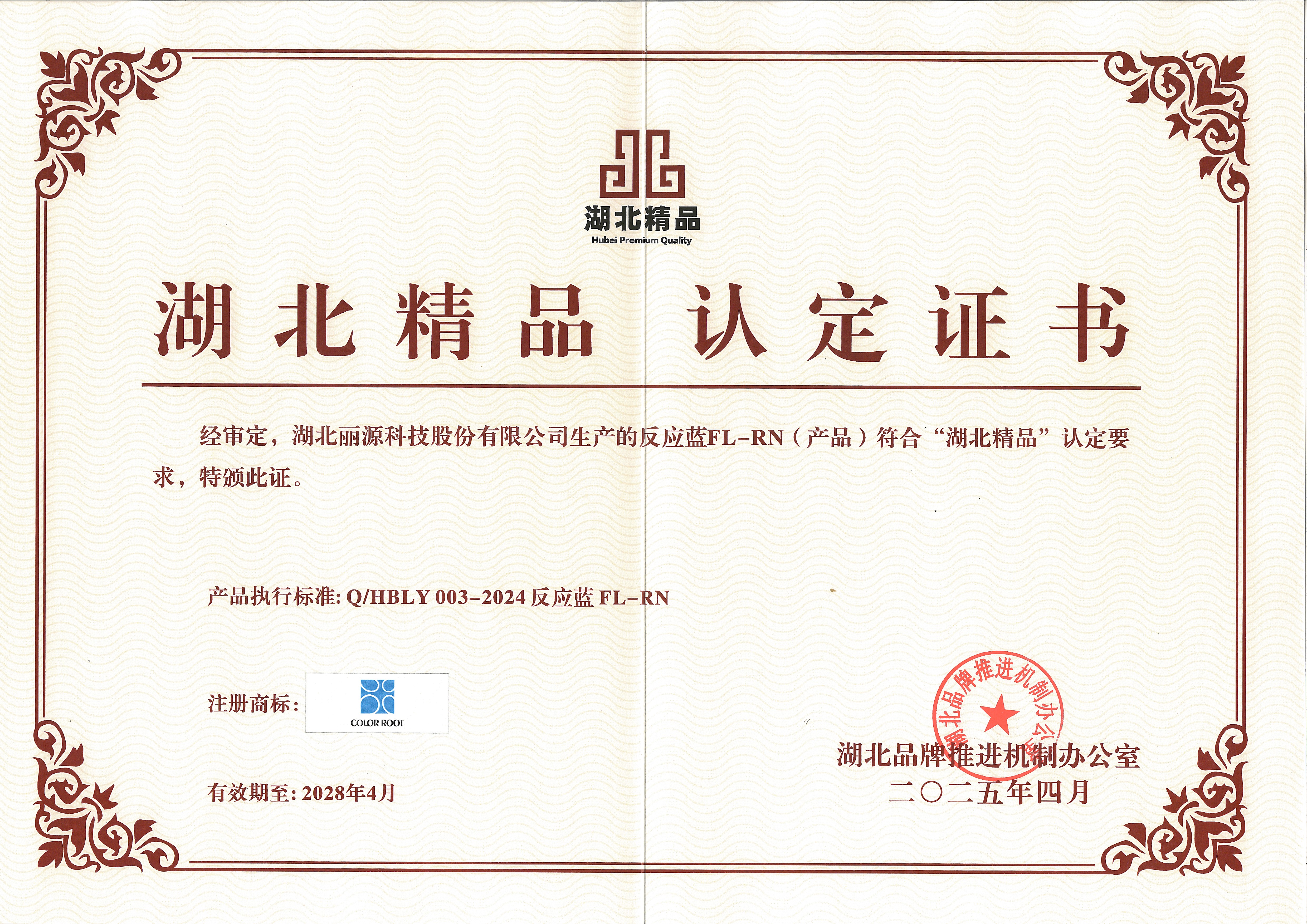 2025年4月,丽源科技生产的反应蓝FL-RN获得「湖北精品认定」证书。